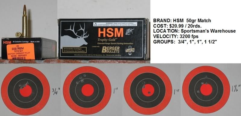 1. Are the results in order, top to bottom, as your testing went on that day? 2. Did you adjust your optics as the day went on? Seems like your groups slowly moved toward center as the tests continued. 3. How do you like the Vortex scope? Not to get off topic, but, I'm considering a Vortex Viper PST 6-24x50 FFP for my RRA LAR-8 Varmint. |